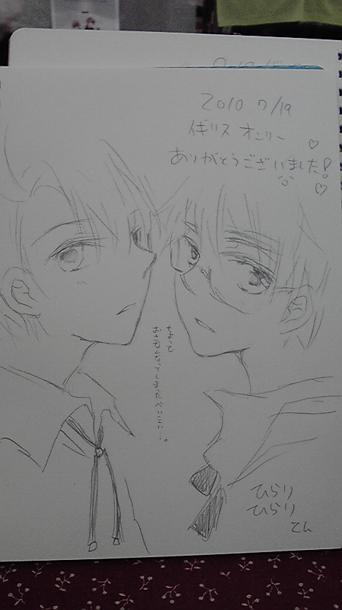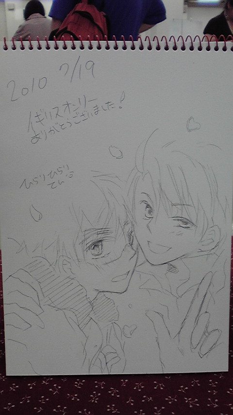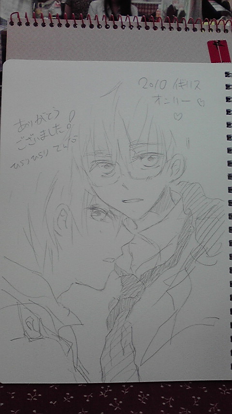 UKオンリーから帰って来ました…!!素敵でした!きっらきらしたイベントでした。あまりに幸せではやく家に帰ろうとしてしまった。(かみ締めるために…幸せが信じられないのはイギリスとおんなじだねごほっごほ)そしたら家の鍵忘れていて締め出されました。ノオ…ッ 夏×今日(微分)脱水= 死 ぬ ってもー!すんでのところで発見されましたがああよかった。夏コミ前に死ぬところでした。死にたくない。無事です。