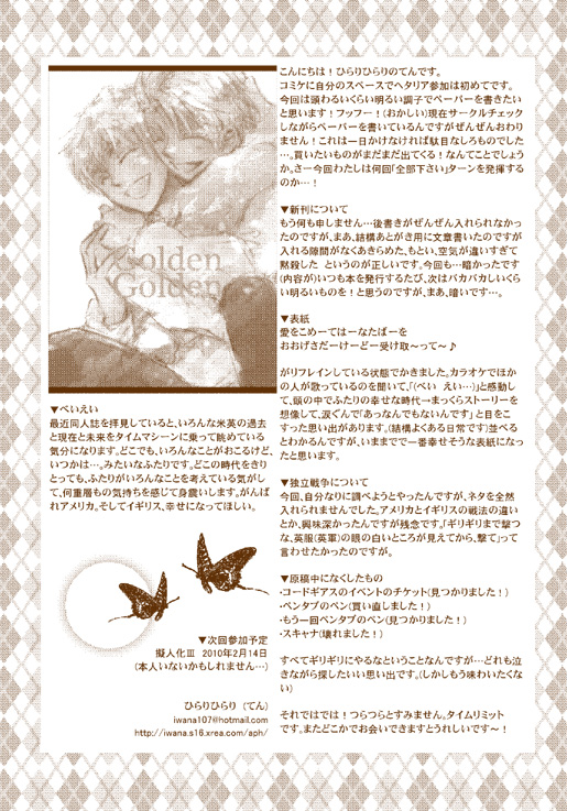 ~精神学者のフロイトのオイディプスコンプレックスによると、「父を殺さなきゃ母を手に入れられない」そうなんですが、それを聞いたら、じゃあアメリカってどうなんだ…?って思ってGolden Goldenを書きました。アメリカにとって英は父=母なわけで、殺しちゃったら手に入れられないわけで…。……。……。わ~アメリカってかわいそう。かわいそうですね。けれどもそれすらも萌萌!と思って描いてしまいました…。(非道)